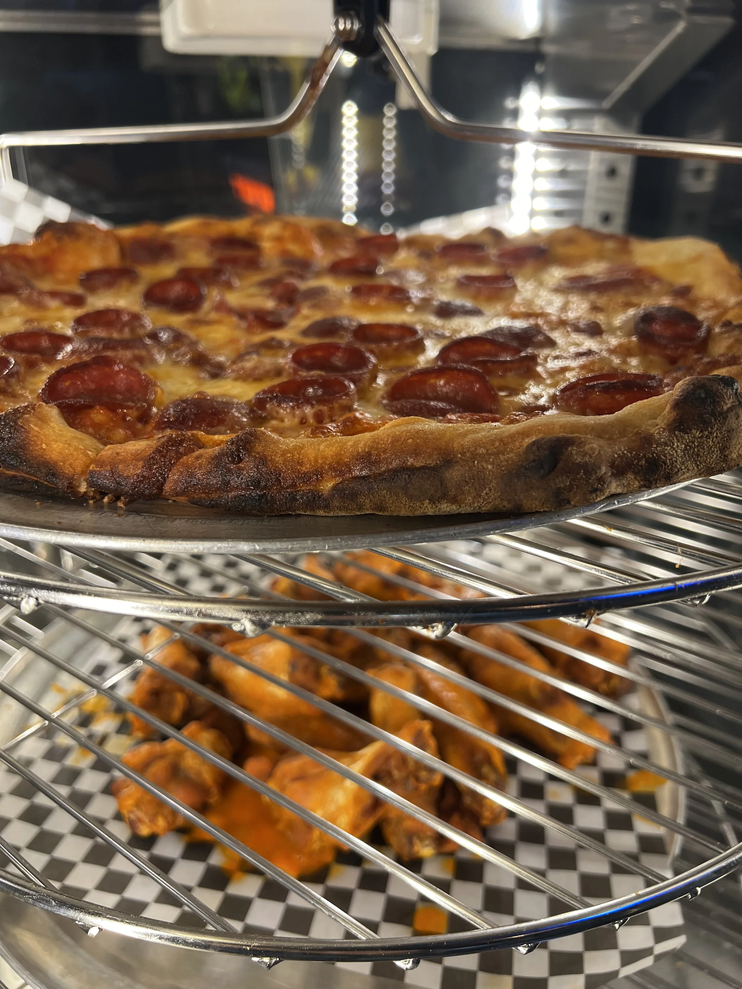 Wood fired. Cup and char pepperoni. Served hot and ready.